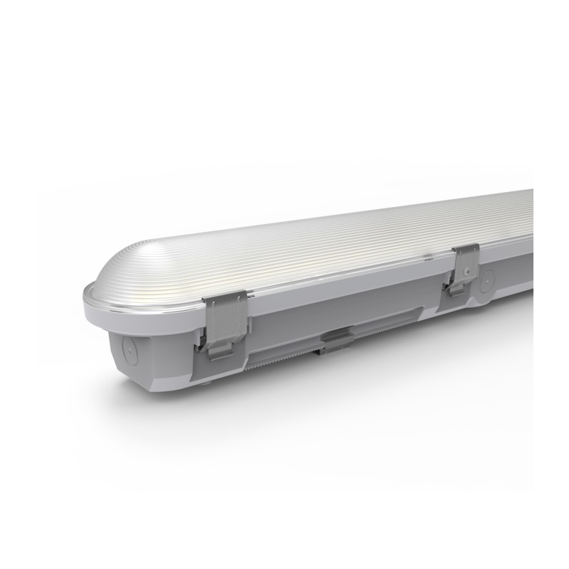 Farb- & Wattage schaltbare, modulare, hocheffiziente IP66 Feuchtraumwannenleuchte mit korrosionsbeständigem Gehäuse – entwickelt für anspruchsvollste Anwendungen im Innen- und Außenbereich. Zukunftssicheres, upgradefähiges vollständig modulares Design ermöglicht werkzeuglose Erweiterung und Wartung von LED Platine, Treiber, Notlichteinheit und Sensorik. Robuster Korpus mit vorgestanzten seitlichen und rückseitigen Kabeleinlässen, integrierter Kabelführung und beidseitigem Anschlussblock für eine schnelle, werkzeuglose Durchverdrahtung. IP66 korrosionsbeständiges und IK08 vandalismussicheres Polycarbonatgehäuse, geeignet für ungeschützte Außenbereiche. Einsatzfähig bei Umgebungstemperaturen von –20 °C bis +45 °C. Positionsjustierbare Montageclips, vandalismussichere Edelstahlklammern und seilgesicherte Trägerplatte ermöglichen eine sichere, freihändige Überkopf-Installation.