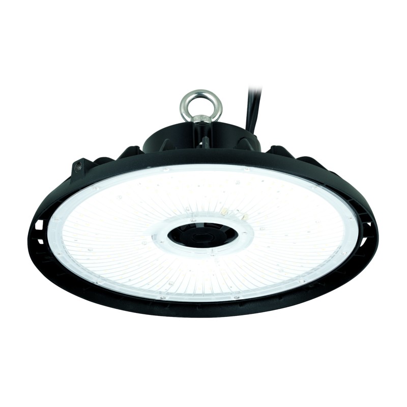 High Power IK10 impact resistant IP65 LED Highbay with superior efficiency of 180lm/W. Tool free interchangeable Lense design. Comes with 120° lense as standard, 90° lense options available as accessory. Integrated 0-10V dimmable LED driver pre-wired with 1500mm cable/220mm dim wire for ease of installation. 800mm safety cable included. Zhaga base for plug and play Microwave or PIR Sensor Module with detection range up to 12m. Sensor options available as accessory. Suitable for -40° - +50° ambient working temperature.