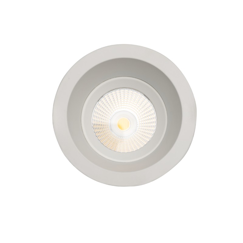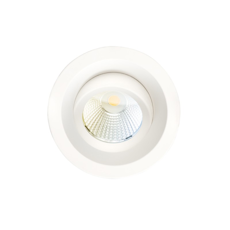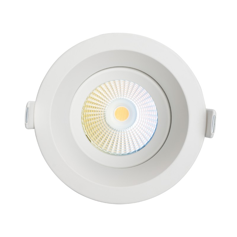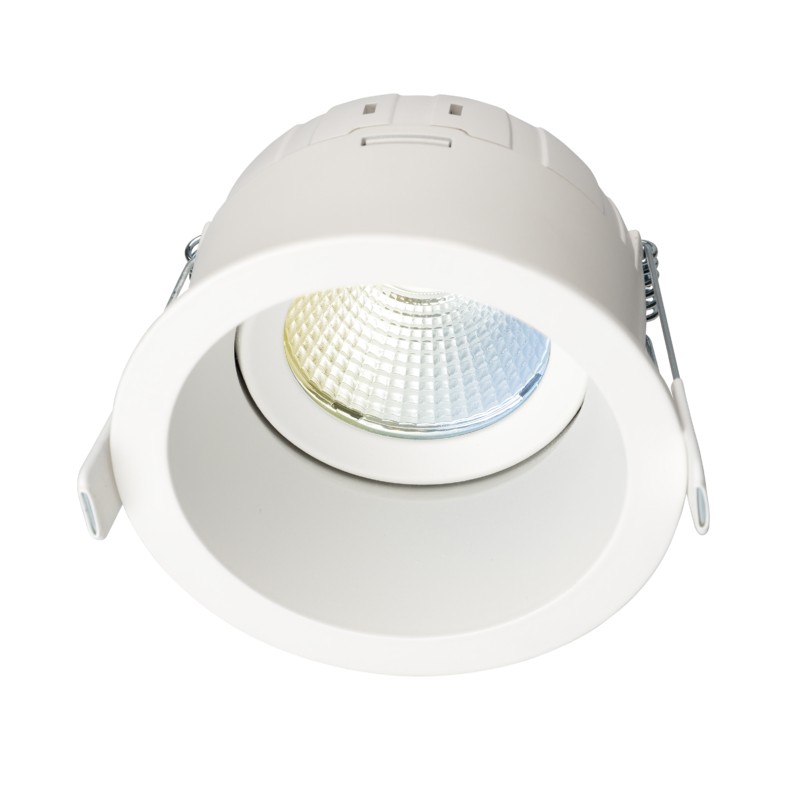 Colour & Wattage Switchable IP44 Adjustable Low Glare Triac dimmable Aluminium LED Baffle Downlight White. Baffled 30° horizontal adjustable design with the light source recessed to reduce glare. CRI90 for superior colour representation. Rapid tool-free installation through loop in / loop out push-fit wiring terminals with strain relief. Downlight and driver are insulation coverable without the need of additional accessory or insulation cut-out.