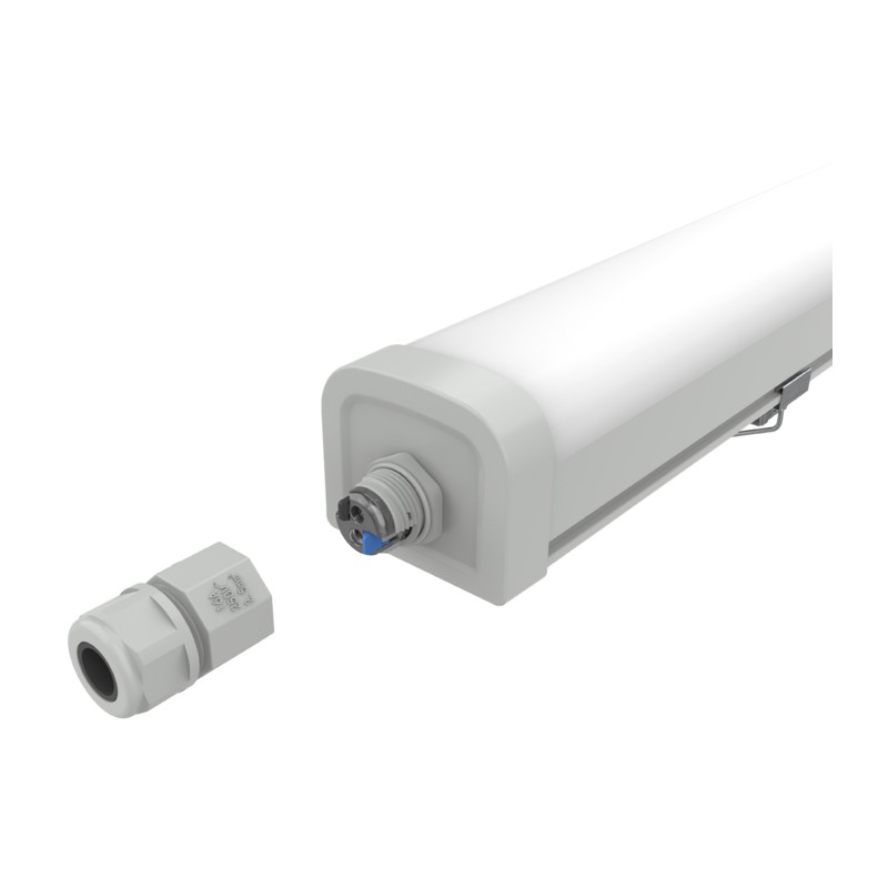 Corrosion-resistant eco linear batten IP66 rated with opal diffuser for even and uniform light distribution offers best value for money. IP66 rated cable glands on both ends with 3pol terminal block enable quick and simple through-wiring and product installation. IK08 polycarbonate diffuser and housing vandal-proof. UV resistant and suitable for installations in unprotected outdoor areas with ambient temperatures from –20 °C to +45 °C.