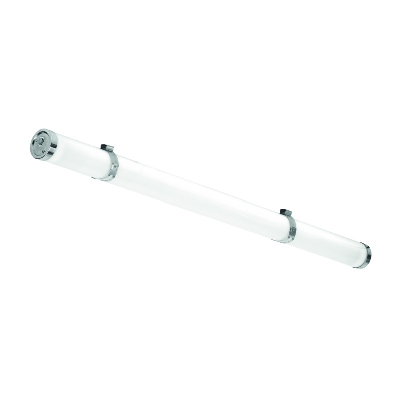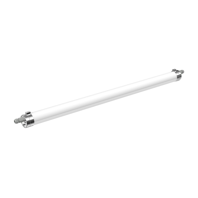 High-Efficiency (150 lm/W) IP69K Corrosion-Resistant Linear Batten with opal UV-resistant polycarbonate diffuser, IK10 rated for maximum impact resistance. IP69K rated and designed for environments requiring heavy wash-down cleaning. Supplied with 316 stainless steel end-caps and mounting brackets for simplified surface installation. Integrated flicker-free, non-dimmable driver with IP69K cable glands on both ends and 3pol push terminals for safe, rapid through-wiring. UV resistant and suitable for installations in unprotected outdoor areas with ambient temperatures from –20 °C to +45 °C.