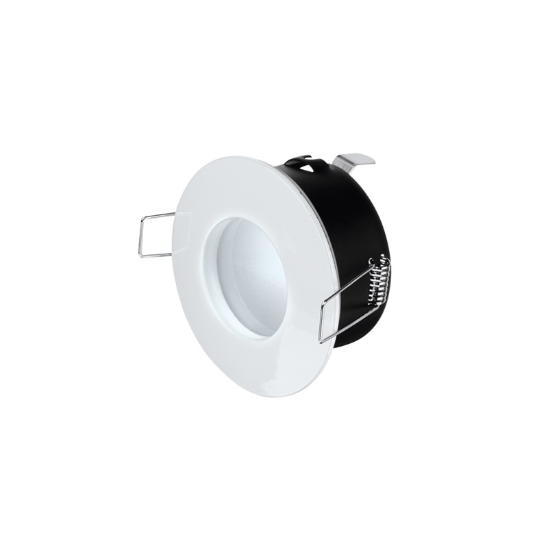 Bathroom Downlight Kit including IP65 Aluminium Recessed Bezel in White, 12V SELV electronic transformer, lamp socket pre-wired with 1 metre cable and GU5.3 5W LED lamp.