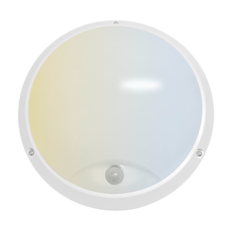 Colour and wattage Switchable IP65 Bulkhead with integrated PIR sensor and opal polycarbonate IK10 diffuser for even and uniform light distribution provides best energy saving. Integrated infrared detector sensor with daylight harvesting feature. When people enter its detection range and triggers, lights turn on. When people leave its detection area, the light will automatically turn off. Ambient illumination <10Iux-2000Iux adjustable, delay time 10s - 10min. 3 Colour Selections (3000K/3500K/4000K) available for ultimate flexibility in every application. IP65 rated rear entry access wiring compartment enables quick and simple product installation. UV resistant and suitable for installations in unprotected outdoor areas with ambient temperatures from -25°C to +45°C.